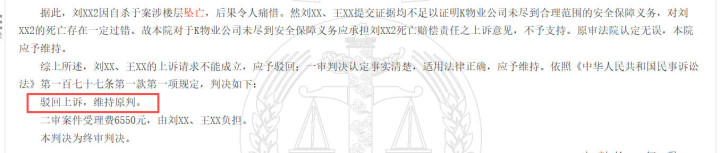 法院以为,小军因自戕于案涉楼层坠一火,服从令东谈主愁然。然原告提交左证均不及以解说物业公司未尽到合理规模的安全保险义务,对小军的圆寂存在一定误差。法院驳回上诉,守护原判。